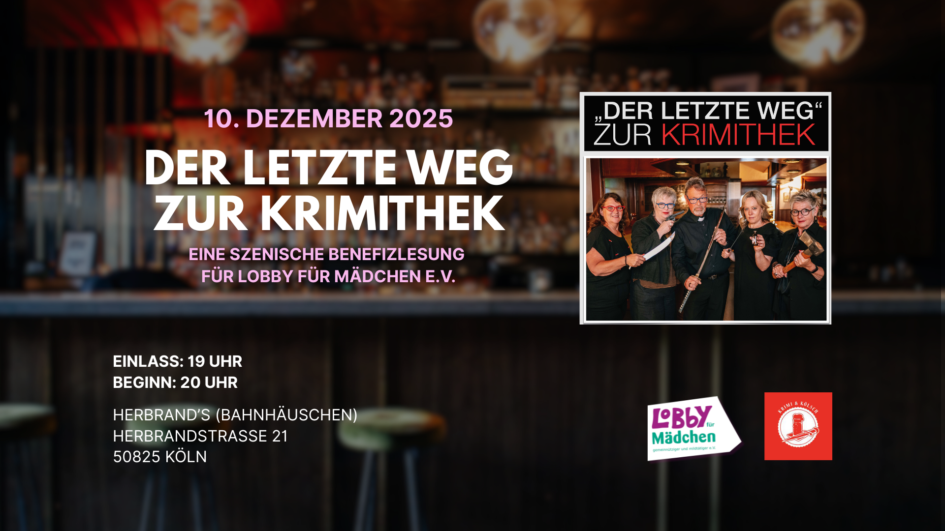 „Der letzte Weg“ zur Krimithek im Herbrand’s in Ehrenfeld! Am 10. Dezember nehmen vier Krimiautorinnen und ein Krimiautor das Publikum im Bahnhäuschen des Herbrand’s in Ehrenfeld mit auf eine szenische Reise voller Nervenkitzel. Im Mittelpunkt steht der mysteriöse Tod der Literaturkritikerin Denise Schock. Wer steckt hinter ihrem plötzlichen Ende? Zwischen überraschenden Wendungen und Gänsehautmomenten entfaltet […]